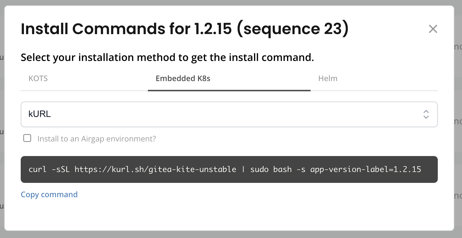 In the dropdown, choose kURL or Embedded Cluster to view the command for the target installer:
