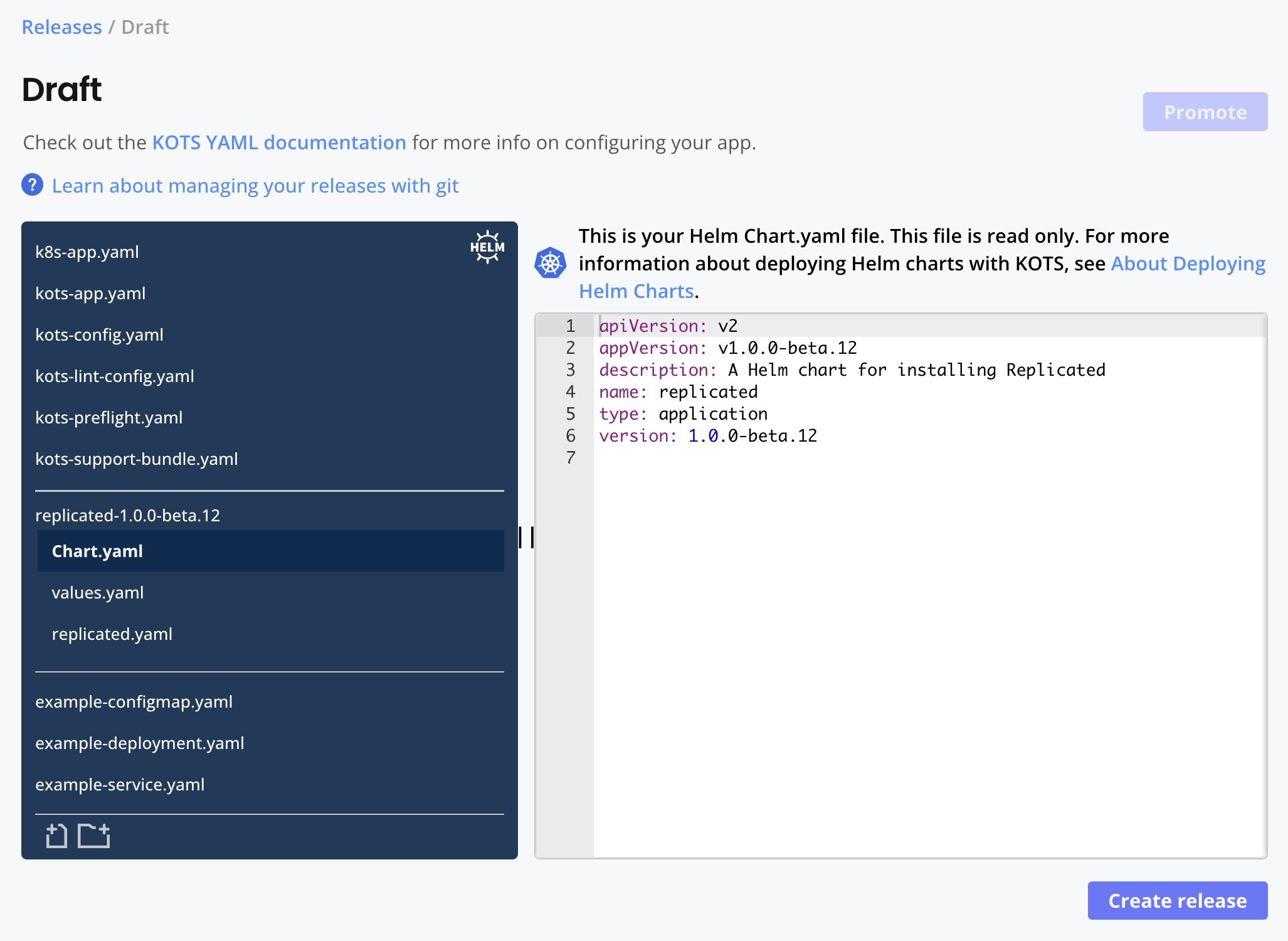 .tgzchart archive to a new release. For more information, see Manage Releases with the CLI or Managing Releases with the Vendor Portal.The following shows an example of the SDK Helm chart added to a draft release for a standard manifest-based application: